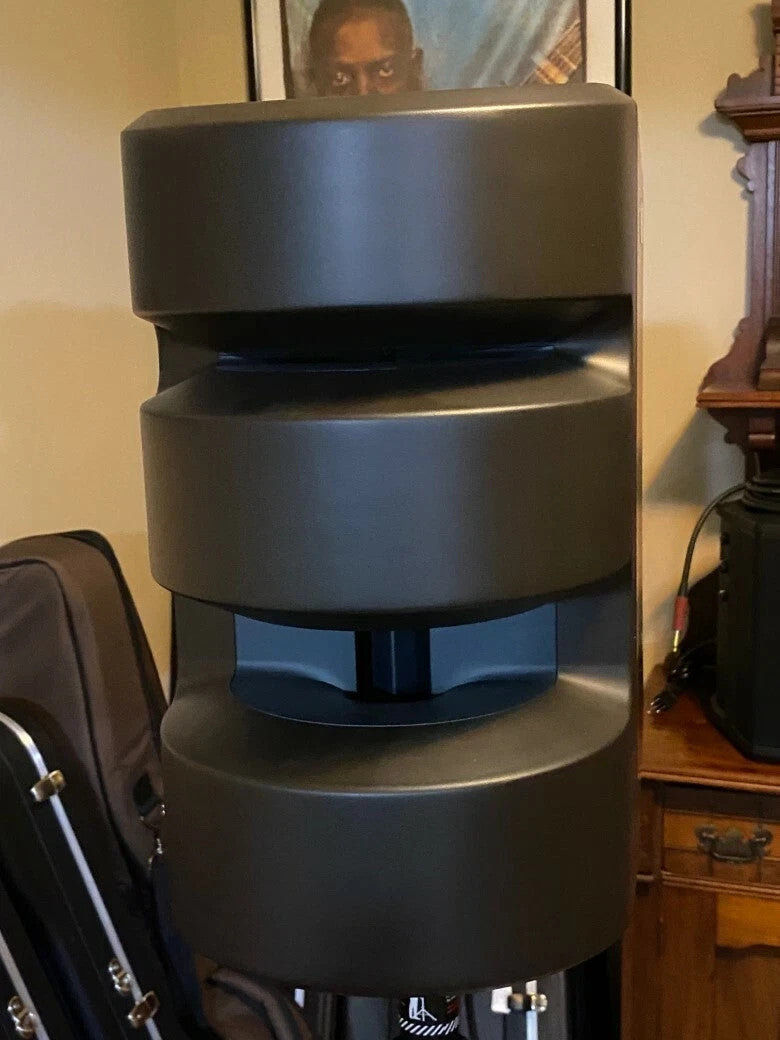 The design of the housing is purely “form follows function”. The front cover was shaped to present a full 180-degree horizontal waveform in a hemispherical pattern. We then constructed a cabinet that would yield our desired frequency response and SPL, while remaining compact for easy portability. The combination of a high quality, walnut veneer plywood cabinet with a speaker baffle and an interlocking front cover made from high density, structural foam minimizes resonances to preserve fidelity of sound.