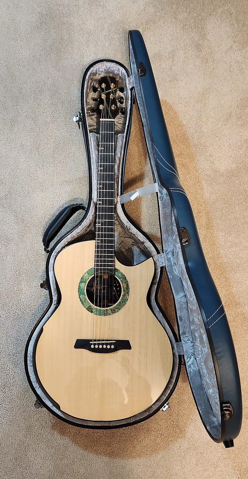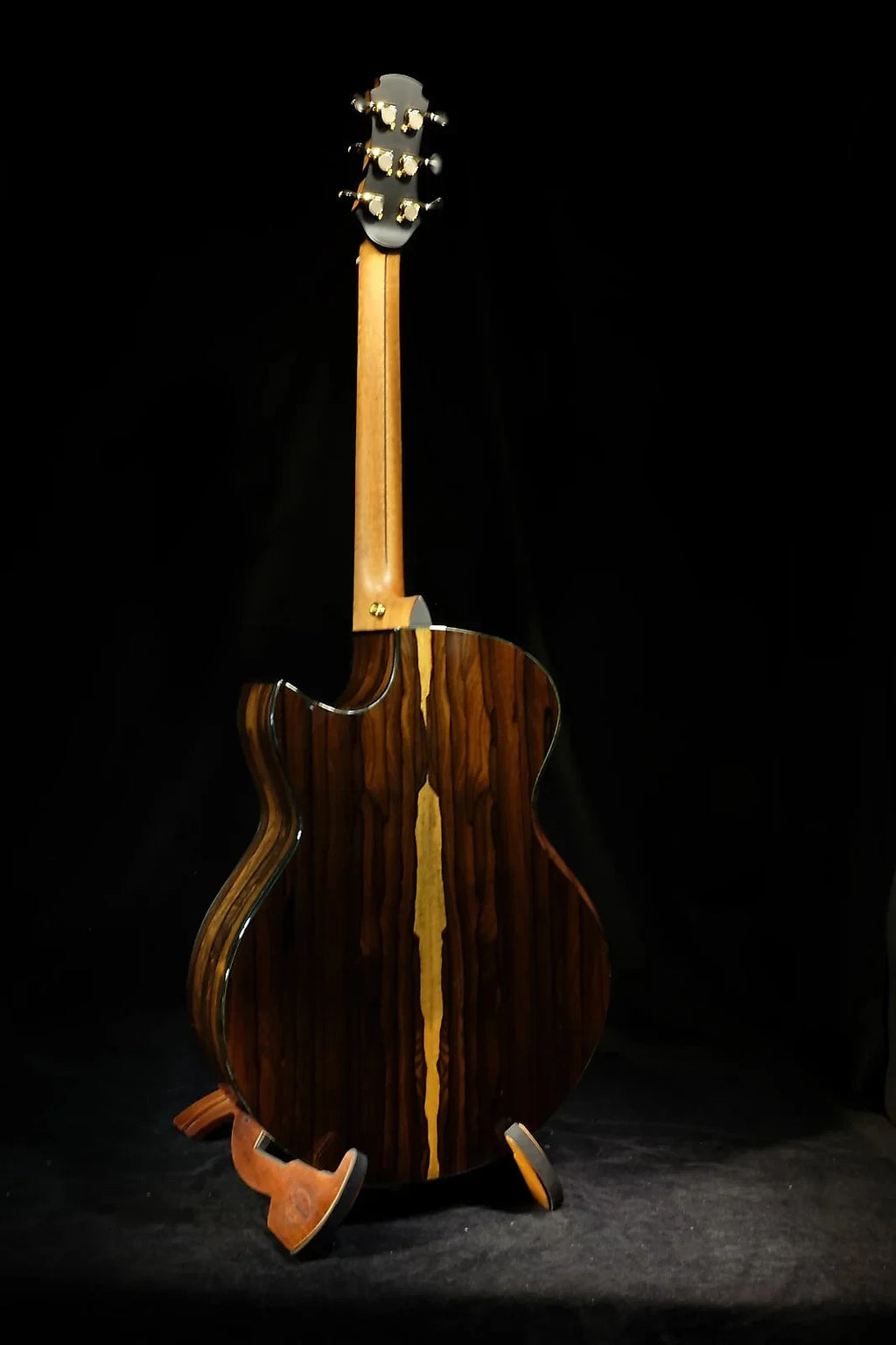 Hozen Guitars differ from the Maestro line as every single piece is unique in design and specifications. It would be unlikely he will make the same thing again unless it’s commissioned. Every instrument is done in the highest workmanship under Maestro Guitar’s build-to-order program whereby he is personally involved in the design, voicing, and crafting of the instrument.
