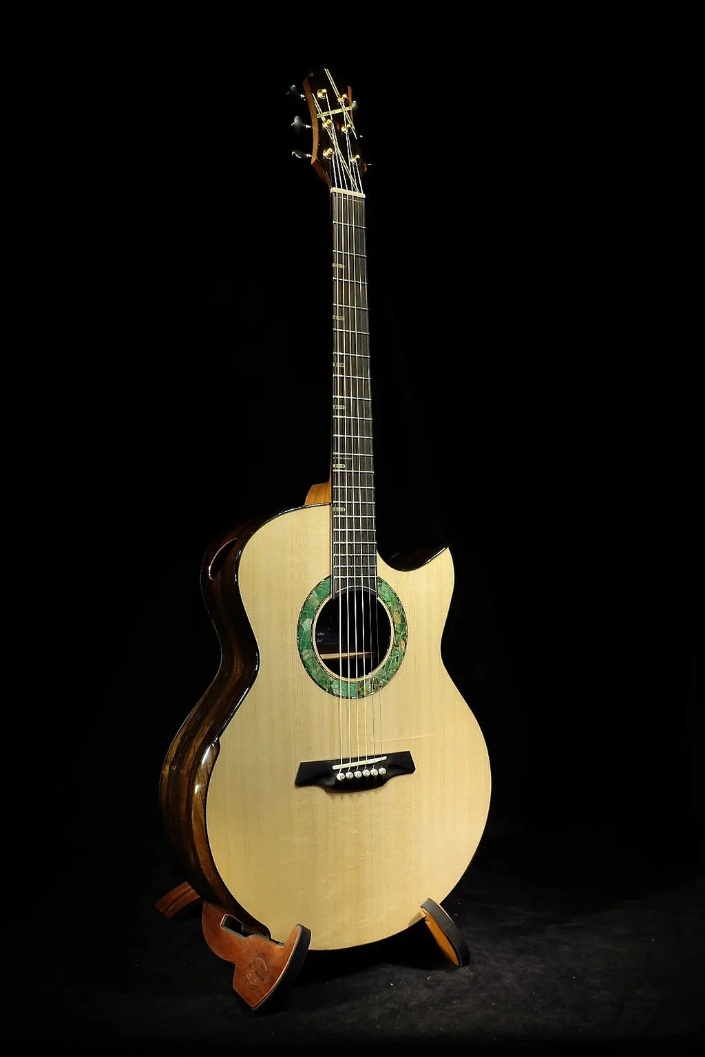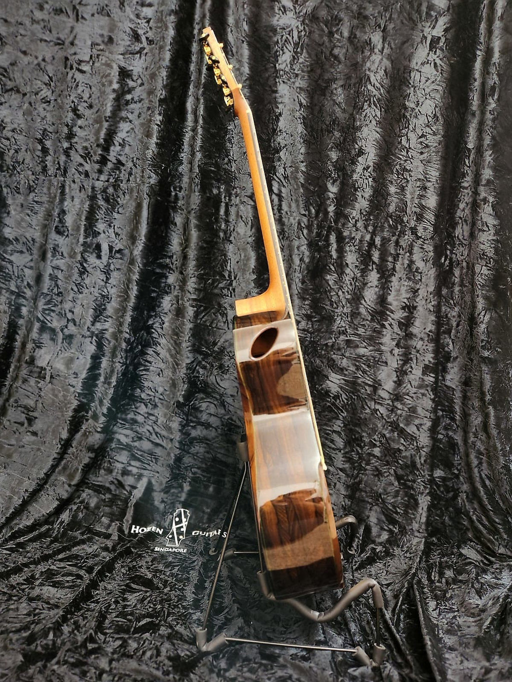 Hozen Guitars are here! Hozen is a Singaporean guitar builder who understudied with Ervin Somogyi for voicing. He founded Maestro Guitars in 2004 and has been building Maestro guitars until today. This pandemic season made him realize that time is limited, and the future is indeed uncertain. He now sees guitar making from a new perspective. He wants to spend his days building guitars as if they are his own to keep, with limits bounded only by his imagination. He started conceptualizing every fine detail that he would like to see in his own instruments. Many of the designs are inspired by amazing builders he knows personally but done up with a twist – a personal touch. It’s never his intention to reinvent the acoustic guitar but only to make the original better. Hozen guitars are born from his desire to give his all as though there is no tomorrow.